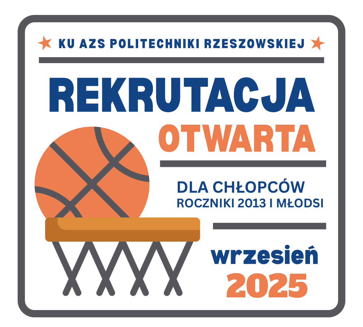 KU AZS Politechniki Rzeszowskiej zaprasza chłopców urodzonych w 2013 roku i młodszych na otwarte treningi koszykówki. Dla nowych chłopców treningi do końca września za darmo!